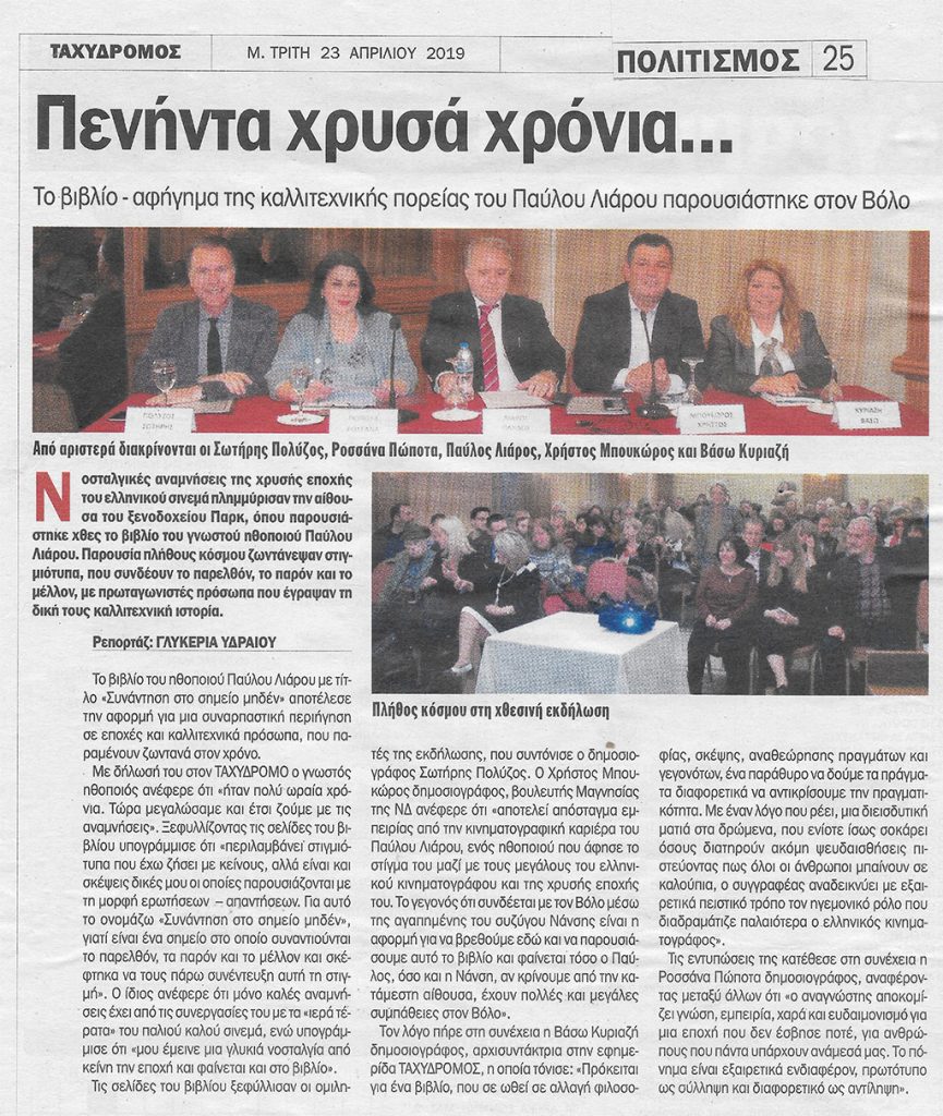 Νοσταλγικές αναμνήσεις της χρυσής εποχής του ελληνικού σινεμά πλημμύρισαν την αίθουσα του ξενοδοχείου Παρκ, όπου παρουσιάστηκε χθες το βράδυ το βιβλίο του γνωστού ηθοποιού Παύλου Λιάρου. Παρουσία πλήθους κόσμου ζωντάνεψαν στιγμιότυπα, που συνδέουν το παρελθόν, το παρόν και το μέλλον, με πρωταγωνιστές πρόσωπα που έγραψαν τη δική τους καλλιτεχνική ιστορία. Το βιβλίο του ηθοποιού Παύλου Λιάρου με τίτλο «Συνάντηση στο Σημείο Μηδέν» αποτέλεσε την αφορμή για μια συναρπαστική περιήγηση σε εποχές και καλλιτεχνικά πρόσωπα, που παραμένουν ζωντανά στο χρόνο.